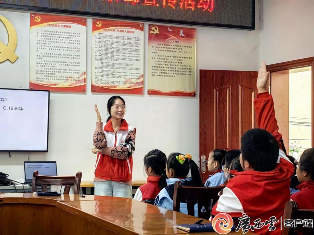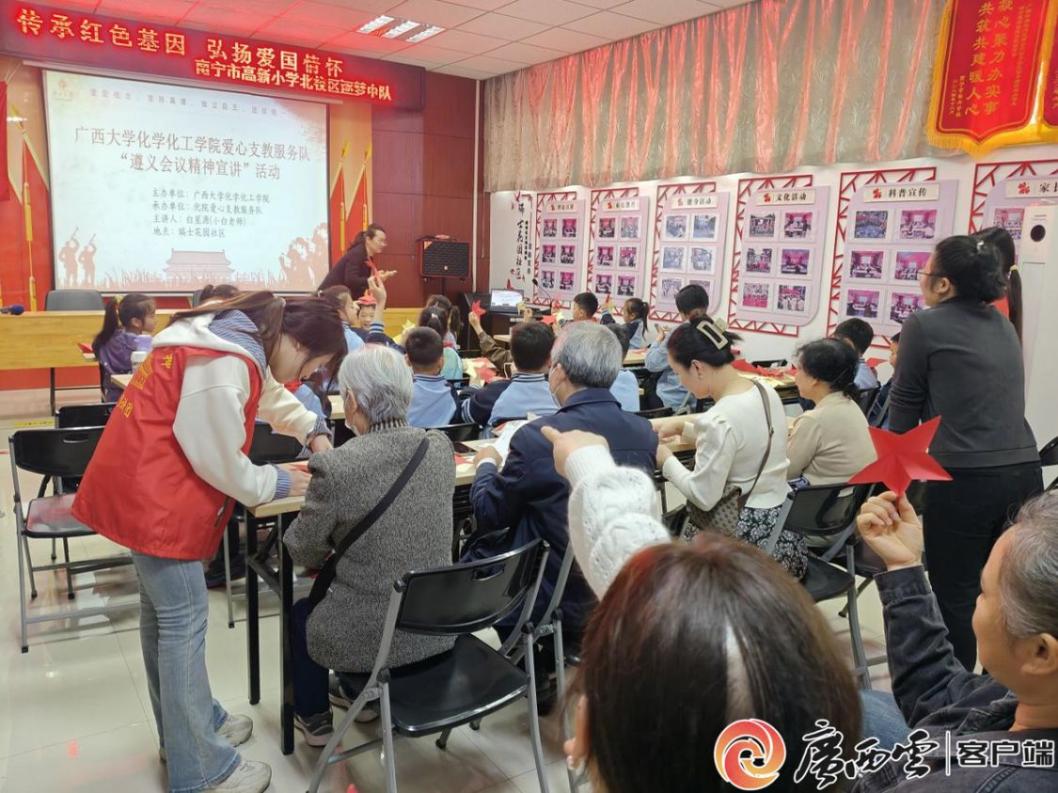 在志愿服务宣讲活动期间,黄色网站免费在线观看国产又色又粗又黄又爽“爱心支教服务队”志愿宣讲团以实践宣讲为指引,深入南宁市多个社区与中小学校,开展十余场遵义会议精神宣传讲解活动,辐射在校学生、社区居民,企事业单位员工等800余人,让遵义会议精神在八桂大地点燃星星之火。用鲜活生动的形式把红色历史讲给孩子听,让红色种子播进童心里。