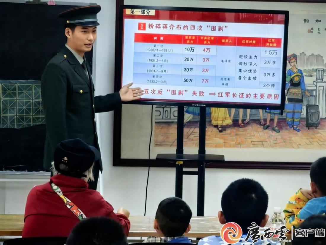 为进一步赓续红色血脉,传承红色基因,宣讲团前往良庆区荣获“全国民族团结进步模范集体”称号的蟠龙社区进行遵义会议精神宣讲。宣讲团邀请了退伍军人大学生周富豪同学将自身的军旅故事融入对遵义会议精神时代内涵的阐释。他在部队里淬炼出的忠诚与担当在青少年心中播种了红色基因,很多孩子在互动环节表现出对参军报国的向往和憧憬。