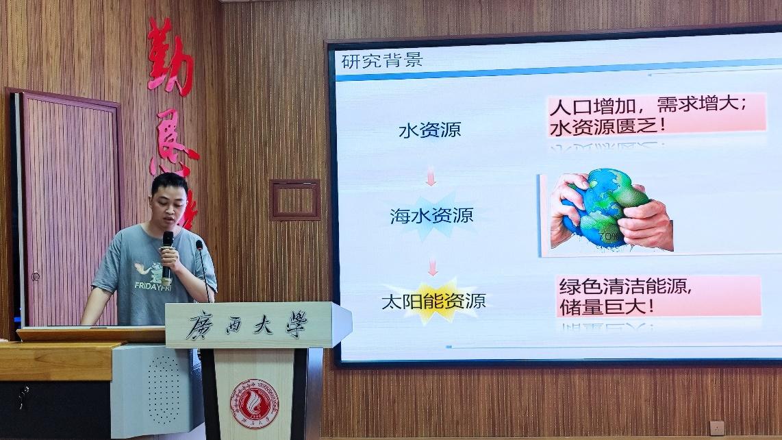 第二场报告题为《地聚物基光蒸发膜的制备及其应用》,报告人为2020级博士生邓兴发。他从理论上阐述了基于地聚物的概念和分类,从地聚物基光蒸发膜的常规的制备方法入手一步步引申,最后对于其在生活、工业生产中的应用进行了总结。