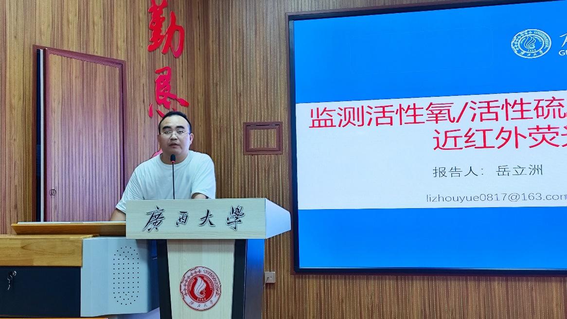 开幕式结束后进行两场学术报告。2020级博士生岳立洲首先带来题为《检测活性氧/活性硫在生物体内水平变化的近红外荧光探针的设计》的专题报告。在报告的问答环节,同学们纷纷提问,气氛非常活跃。