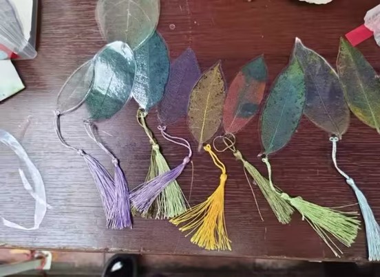 活动开始前,志愿者将活动所需的材料和工具整齐摆放在桌面上,等待同学们的到来。不过多时,同学们来到现场参与活动,志愿者们向其介绍叶脉书签的制作原理,并展示叶脉书签成品。接着同学们亲自体验制作:刷叶肉、染色、过塑、裁剪并加装流苏。在此过程中,通过志愿者们的耐心指导和细致示范,同学们掌握了刷叶肉的正确方法,即往内刷与往外刷相结合,同时保持叶片湿润。同学们保持高涨的热情,在一次次的失败后,做出令自己满意的书签。