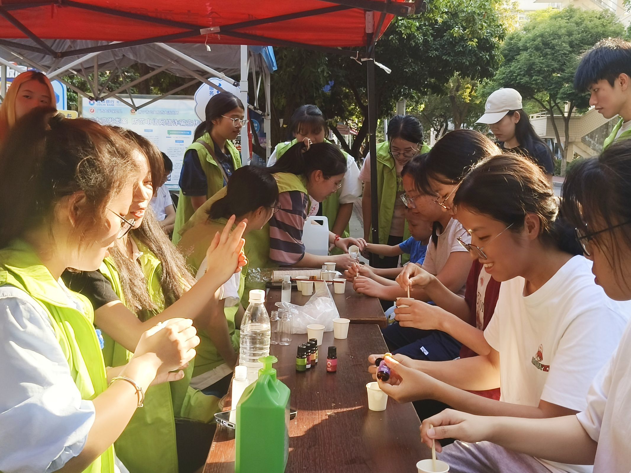 活动前,志愿者们准备了消毒酒精、芦荟凝胶和八种精油,供同学们活动时使用。活动中,志愿者们首先为同学们提供成品试用,并介绍免洗洗手液的制作与消毒原理——酒精起消毒作用,但会使皮肤脱水干燥,而芦荟胶作为护肤品可以缓解干燥。接着,同学们在志愿者的引导下,把酒精和芦荟凝胶按1:2的比例混合,再添加自己喜欢的精油,最后用小棒充分搅拌至颜色发白,免洗洗手液即可完成。此次活动不仅吸引了同学们前来参与,不少家长也带着自己的孩子来体验洗手液的制作。随着活动的进行,越来越多的人参与其中,大家在轻松愉悦的氛围下学会了一项新技能。