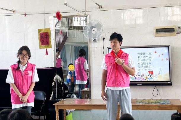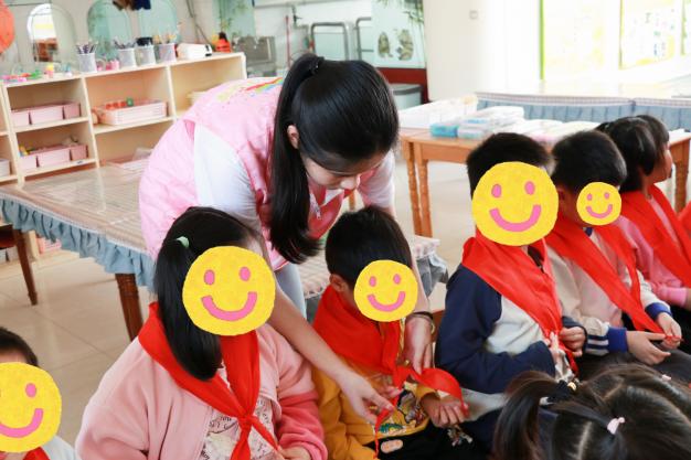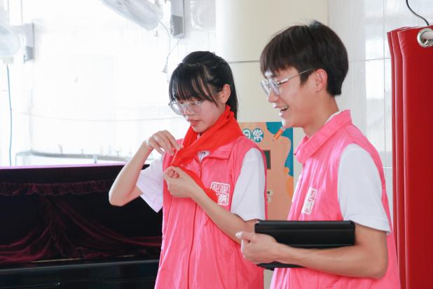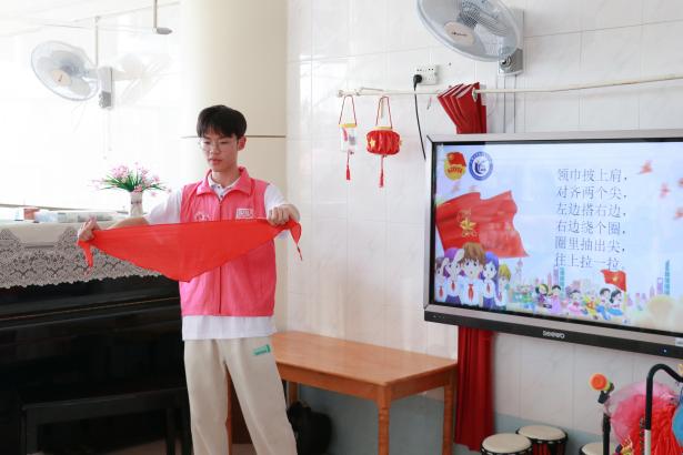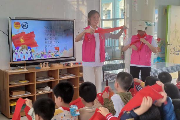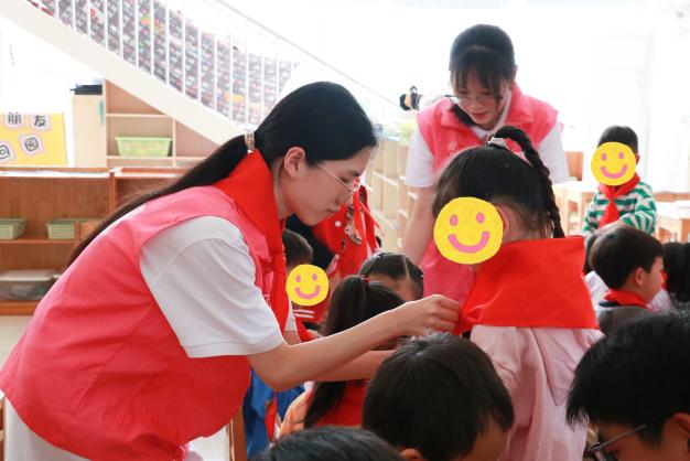 我院志愿者代表们充分发扬了雷锋精神,为即将踏入小学校园的小朋友们亲手系上鲜艳的红领巾。“领巾披上肩、对齐两个尖……”,在现场不断重复地口诀中,志愿者们一遍又一遍认真地教导小朋友们学习佩戴红领巾的步骤,在志愿者的带领下,小朋友们学会了如何自己佩戴红领巾,并开心展示。
