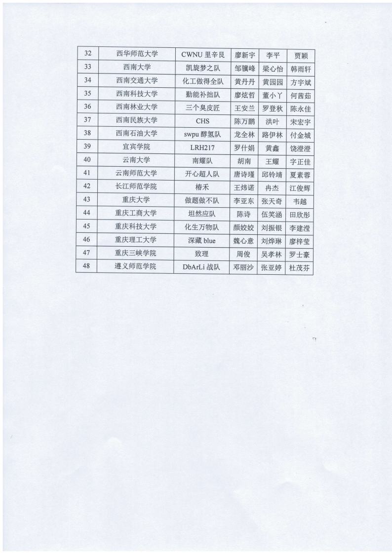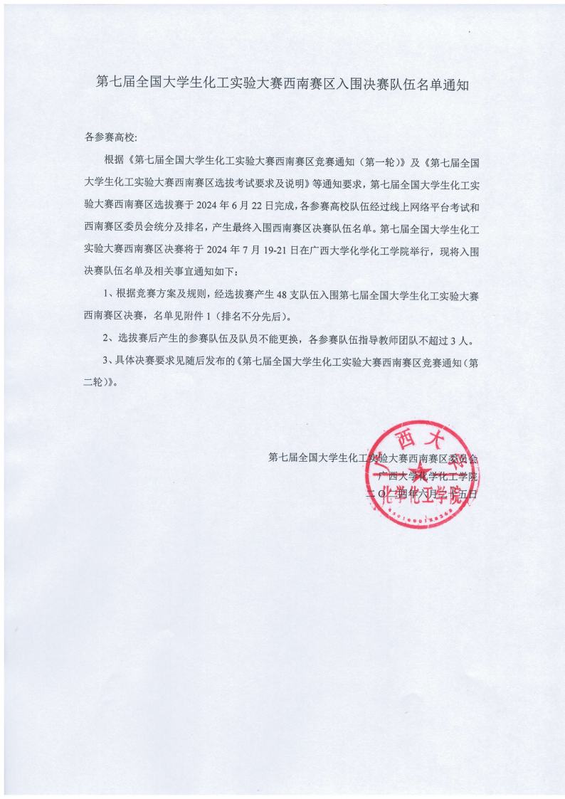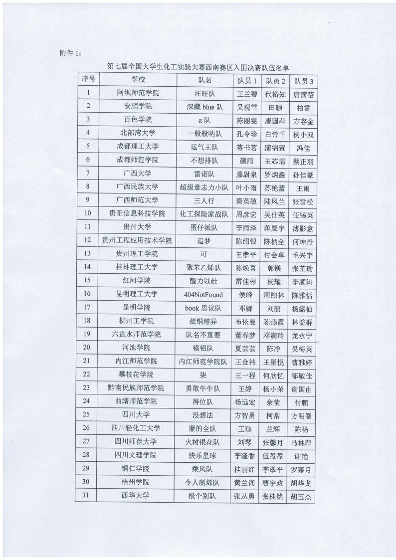 第七届全国大学生化工实验大赛西南赛区入围决赛队伍名单通知