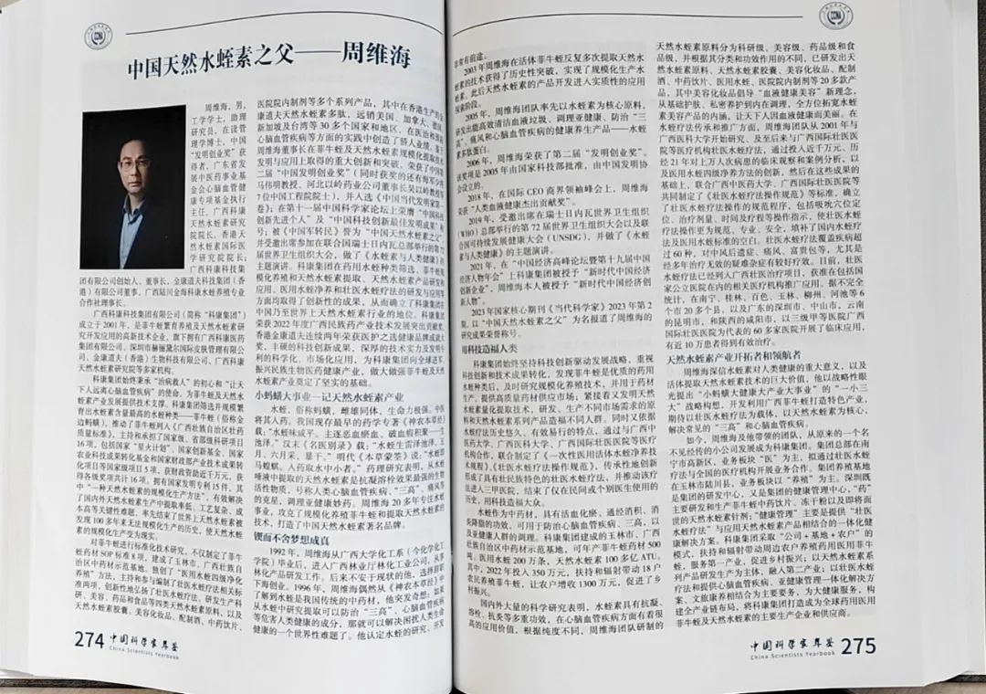 2023年度《中国科学家年鉴》以“中国天然水蛭素之父”为名用两个整版全面介绍周维海董事长