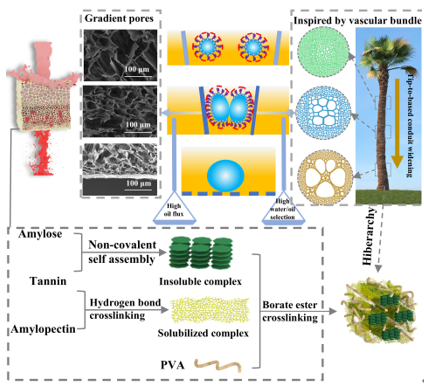 在油品的加工、运输和储存过程中,水分含量不可避免地增加,导致油品劣化形成乳化油。三维生物质气凝胶被认为是很有应用前景的水/油分离材料,但其微孔和介孔网络相互连接,油易于被毛细管力保留在其中,不利于油相的渗透。通过调节生物质气凝胶的孔结构可以降低传质阻力,提高水/油分离的通量,但仍然存在复杂乳液体系中分离通量与截留率之间的权衡效应。基于此,该团队受植物维管束独特管道结构的启发,创新性地提出了一种焓-熵共驱动策略,通过单宁酸/直链淀粉非共价键自组装和硼酸酯键动态交联,设计合成具有自顶端至底部沿轴向增宽的梯度多孔结构、可自修复的生物质气凝胶。该气凝胶独特的多孔结构有效打破了传统水/油分离材料在通量与截留率之间的权衡效应,实现高效水/油分离,且具有机械损伤、化学侵蚀自修复功能和生物降解性能,具有广阔的应用前景。