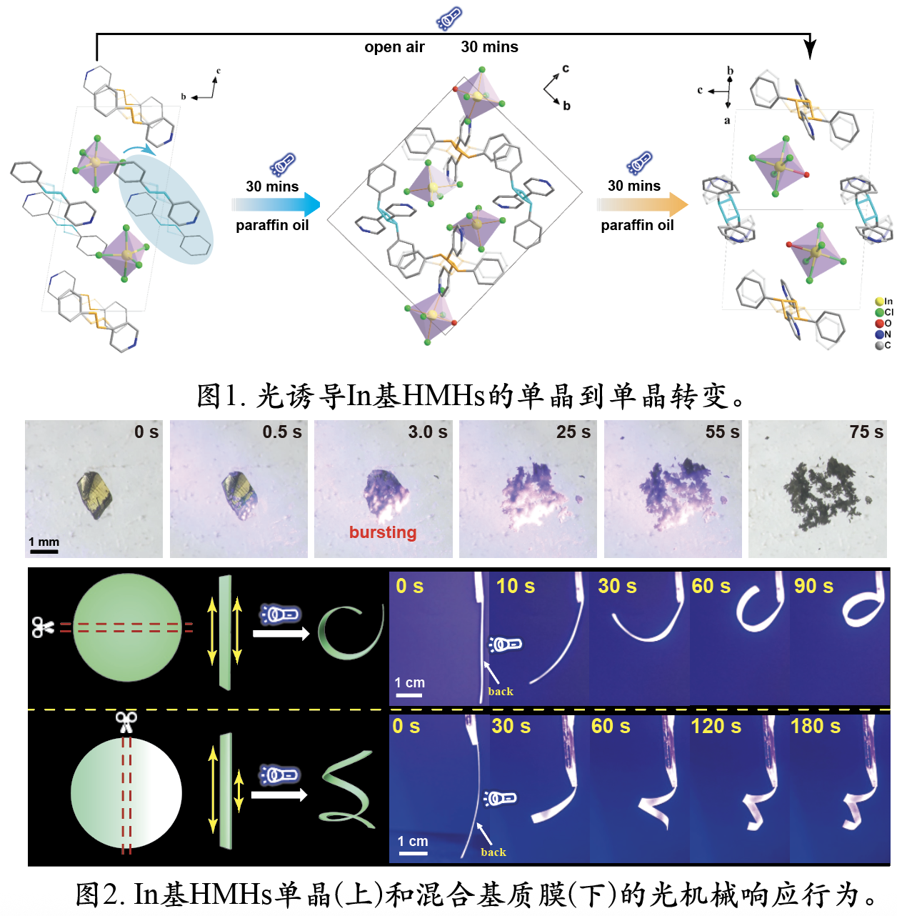针对上述问题,该团队基于兼具有机组分光反应活性与无机组分机械强度的离子型杂化金属卤化物(HMHs),创新性地构筑了一例具有不饱和配位点的零维In基HMHs。在光照过程中,有机组分发生环加成反应的同时会诱导不饱和配位中心金属位点的水吸附过程,两者的协同效应产生了显著的组分位移和晶胞体积变化,最终产生明显的光机械响应行为。