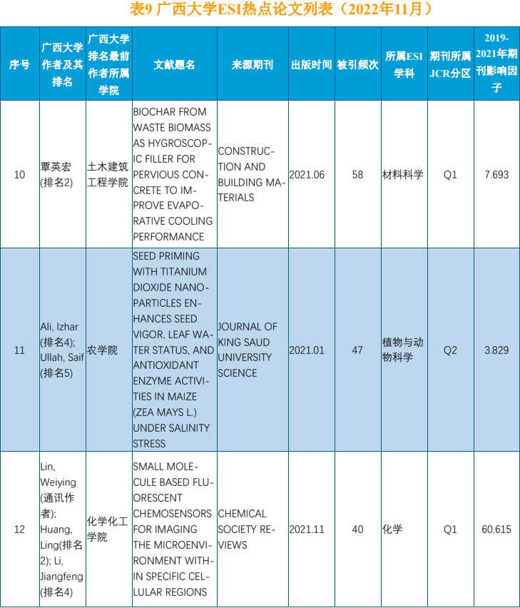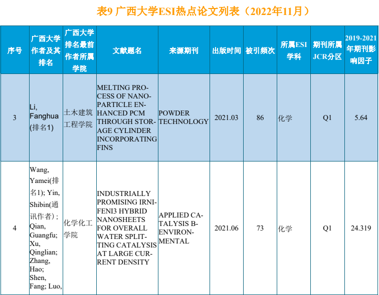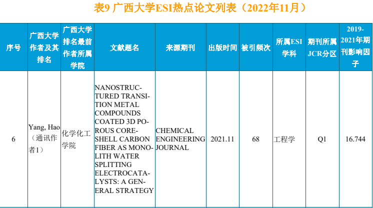 我院此次有三篇ESI热点论文,位居全校排行榜第二。第一篇是尹诗斌教授为通讯作者在APPLIED CATALYSIS BENVIRONMENTAL发表的《INDUSTRIALLY PROMISING IRNIFENI3 HYBRID NANOSHEETS FOR OVERALL WATER SPLITTING CATALYSIS AT LARGE CURRENT DENSITY》,被引73次,2019-2021年期刊影响因子为24.319.第二篇是助理教授杨晧为通讯作者在CHEMICAL ENGINEERING JOURNAL发表的《NANOSTRUCTURED TRANSITION METAL COMPOUNDS COATED 3D POROUS CORESHELL CARBON FIBER AS MONOLITH WATER SPLITTING ELECTROCATALYSTS: A GENERAL STRATEGY》被引63次,2019-2021年期刊影响因子为6.782,第三篇是林伟英教授为通讯作者在CHEMICAL SOCIETY REVIEWS发表的《SMALL MOLECULE BASED FLUORESCENT CHEMOSENSORS FOR IMAGING THE MICROENVIRONMENT WITHIN SPECIFIC CELLULAR REGIONS》,被引40次,2019-2021年期刊影响因子为60.615.