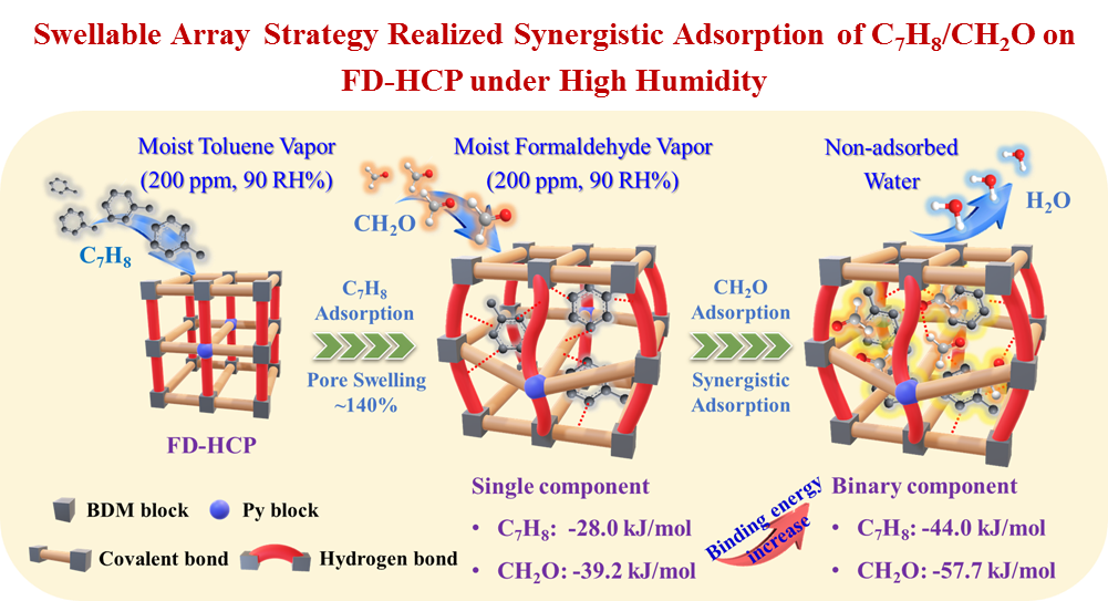 基于对大气环境中复杂组分VOCs吸附去除机制的探索,研究人员在该工作中提出了一种基于柔性双网络聚合物吸附剂的溶胀阵列吸附策略,实现了对痕量甲苯/甲醛混合物的协同吸附。甲苯分子与柔性骨架的强结合力使孔结构变形,增大孔体积,并为后续VOCs分子的吸附创造了新的吸附微环境,大大增加了吸附容量与吸附速率。此外,吸附剂中均匀分散的碱性N位点极大阻碍了H2O分子的扩散,从而有效避免了湿度对VOCs竞争吸附的不利影响。因此,该研究为从实际环境中吸附去除多组分VOCs的可行性提供了方便且具有成本效益的策略。