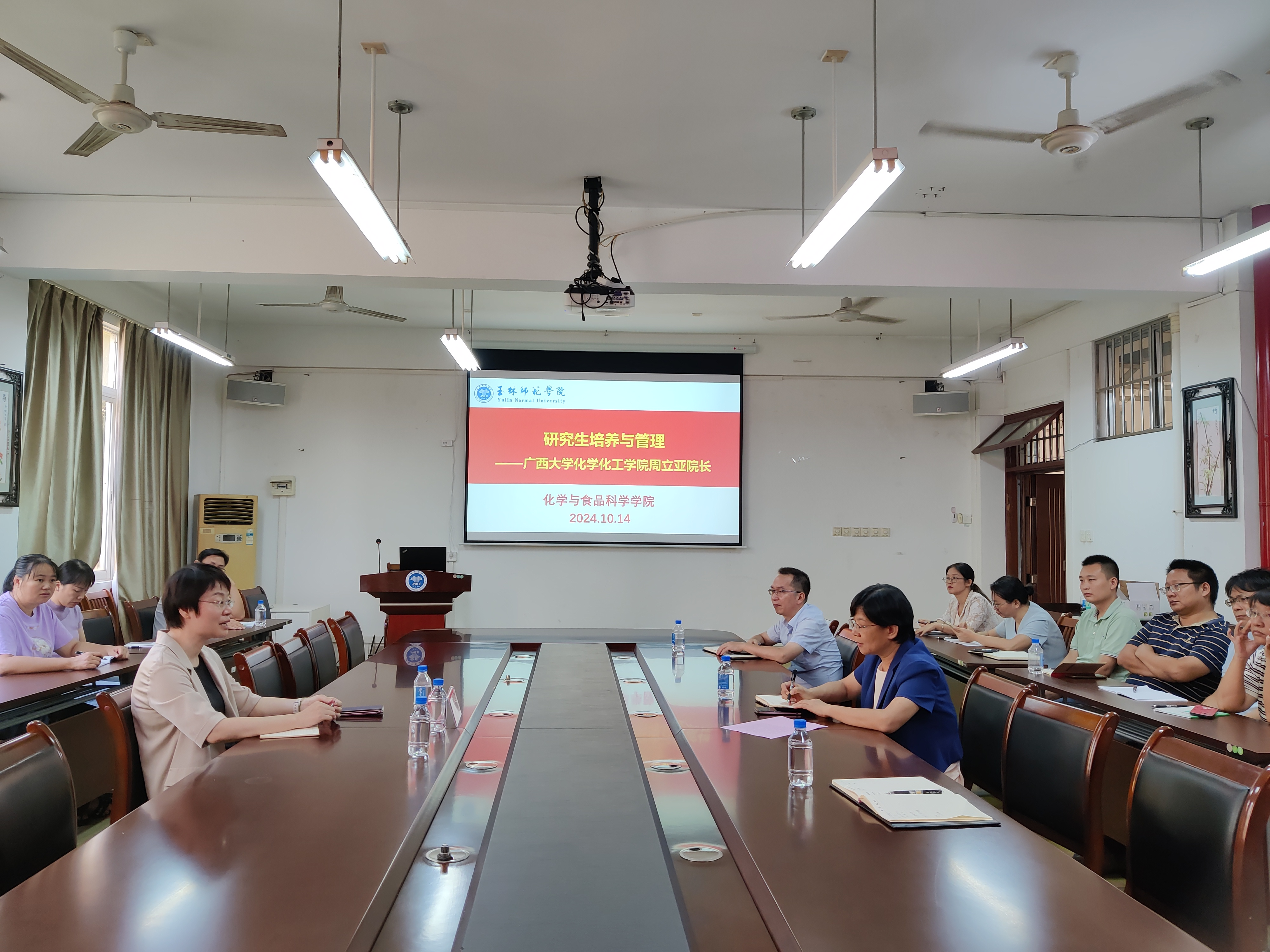 10月14日下午,应玉林师范学院化学与食品科学学院邀请,学院院长周立亚于东校区格物楼BA321会议室作报告并召开座谈会。会议由化学与食品科学学院院长谭明雄主持,化学与食品科学学院领导班子成员、各教研室主任及教师代表参加了会议。