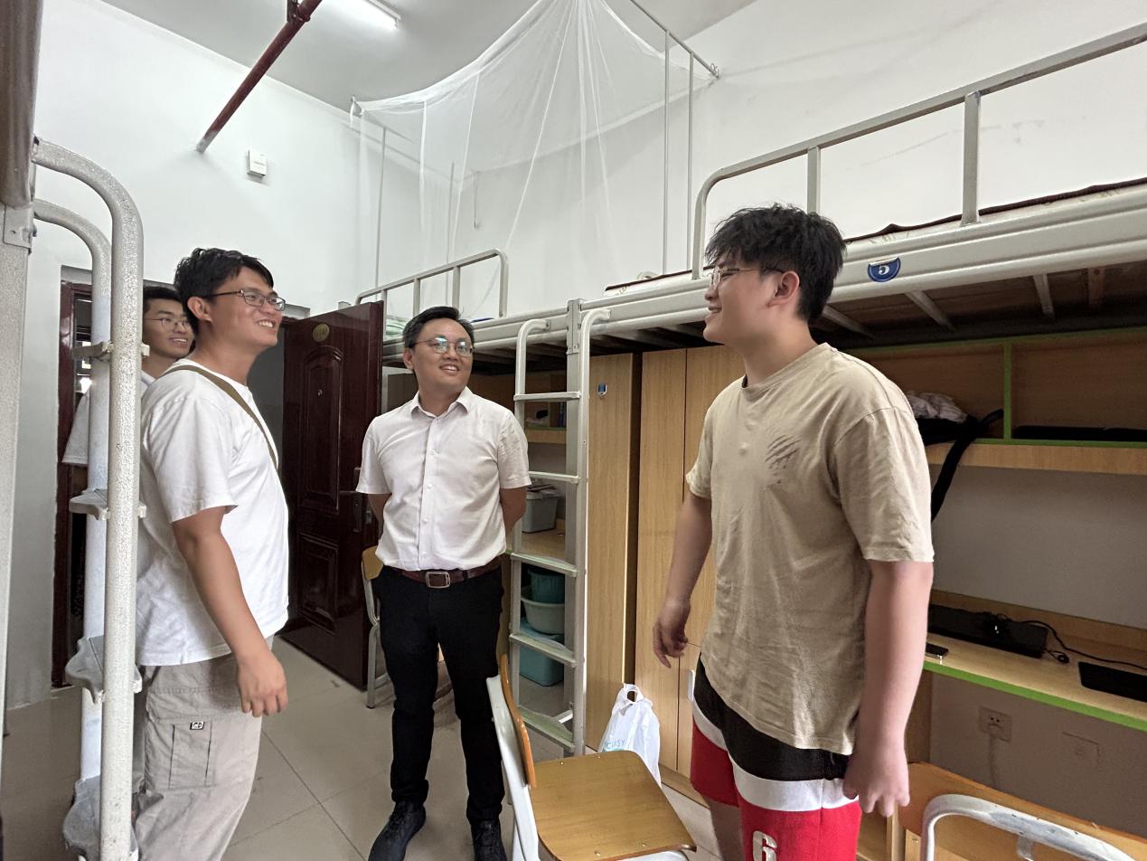 走访中,院领导与新生亲切交流,详细了解同学们的生源背景、入学适应和生活情况。周立亚书记关心同学们的饮食起居,勉励大家互相关照,强调“学院永远是大家的坚强后盾”。秦祖赠常务副院长鼓励新生尽早规划、主动适应。刘丽副书记提醒同学们注意南宁气候特点,做好防蚊防潮、宿舍通风,并检查宿舍设施,嘱咐大家重视人身与财产安全,学会及时向学院反映困难。其他院领导也分别带队深入各新生宿舍,与新生及陪同家长亲切交谈,听取反馈。