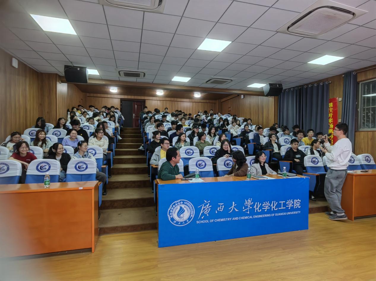 会上,院长助理潘远凤教授就学院化学类专业分流原则、专业分流的具体流程作了详细讲解,同时介绍了历年来我院化学类专业大类招生、专业分流的实施效果,对同学们未来发展表达了鼓励与殷切期望。化学系主任庞起教授和应用化学系主任朱园勤教授分别就专业设置、专业前沿、核心能力培养及未来就业趋势等内容作了宣讲动员,2022级学工辅导员韦永睿老师围绕学院历届化学专业、应化专业的毕业生就业情况进行介绍。