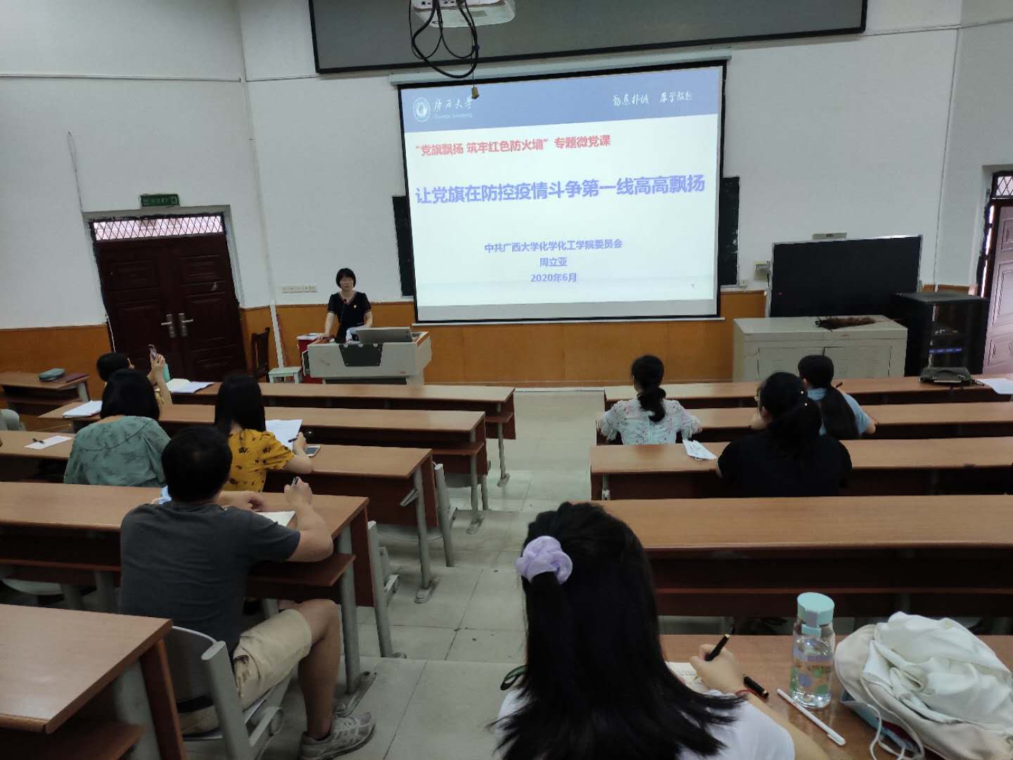 首先,周立亚书记以“让党旗在防控疫情斗争第一线高高飘扬”为题,为大家上“党旗飘扬 筑牢红色防火墙”专题微党课。微党课紧密结合习近平总书记关于疫情防控重要讲话和指示精神,从“让党旗在防控疫情斗争第一线高高飘扬”主题切入,包括三个方面的内容:一是坚持全国一盘棋,彰显中国制度优势,二是践行初心使命,化院师生携手战“疫”,三是助力全球抗疫,推动构建人类命运共同体。微党课之后,周立亚书记带领大家重温了入党誓词,她强调,要以习近平总书记对疫情防控的重要讲话、重要指示精神为指导,慎始如终地做好学校、学院疫情防控,充分认识社会主义制度的优越性,坚定爱党爱国爱社会主义的崇高信念。