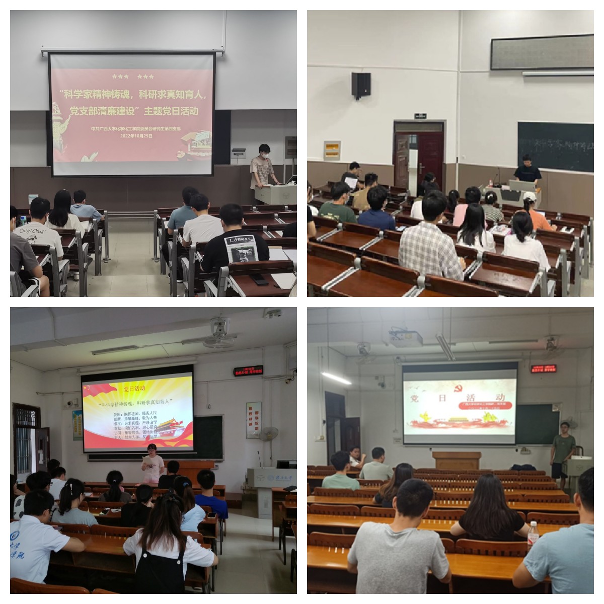 为扎实推进清廉学院建设,学院于2022年10月22至27日开展“科学家精神铸魂,科研求真知育人”清廉党支部主题党日活动,将科学家精神与党支部清廉文化与有机融合,积极营造崇尚廉洁、科研求真的良好氛围。各党支部结合实际工作,以讲课、主题发言、学习文件、观看纪录片、讲故事、分享心得体会的形式开展主题党日活动。