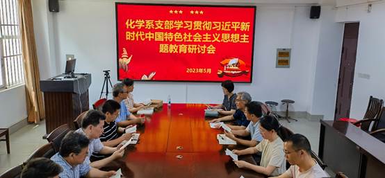 5月31日下午,化学系支部教师党员在学院3号楼217会议室召开了“化学系支部学习贯彻习近平新时代中国特色社会主义思想主题教育学习研讨会”。会议由支部书记周艳玲主持。会前,各位党员已通过个人自学的方式,对党的二十大报告和党章、《习近平著作选读》、《习近平新时代中国特色社会主义思想专题摘编》等主题教育学习材料进行了深入学习。